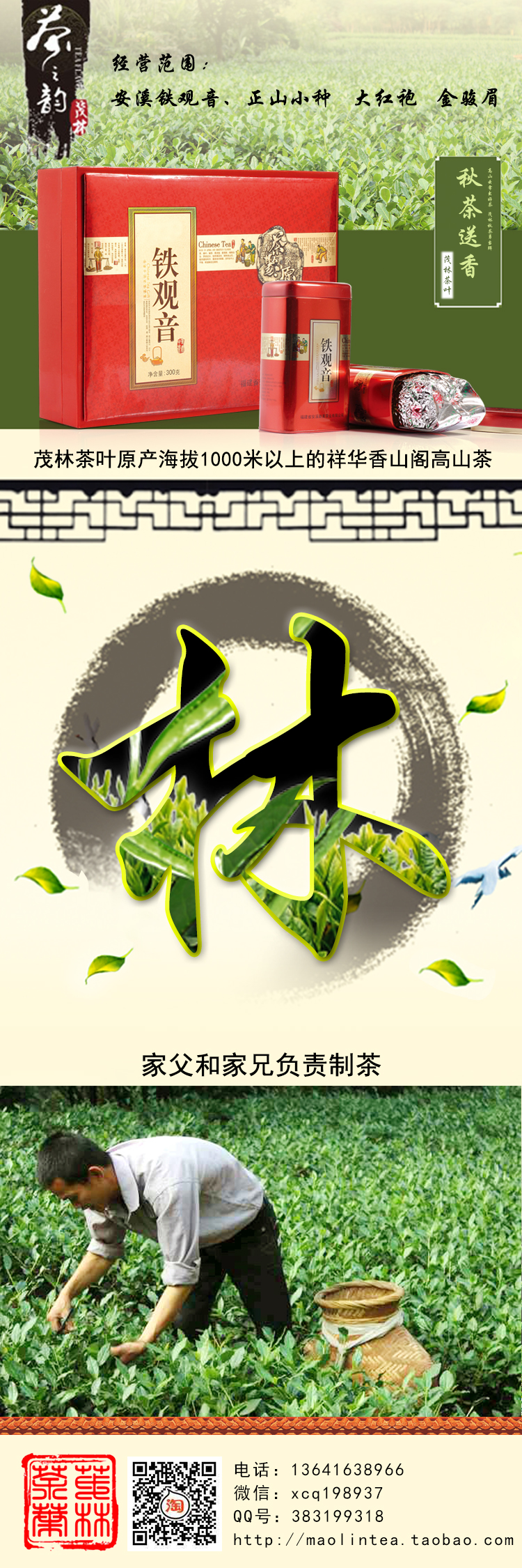 - 茂林茶叶是由籍贯为福建安溪的上海对外经贸大学毕业研究生许长清与其家人共同筹备成立,作为茂林茶叶掌柜,许长清把主营茶叶产品定位为安溪铁观音、正山小种、大红袍、金骏眉,其中铁观音茶叶原产海拔1000米以上的祥华香山阁高山茶, 由茂林茶叶掌柜的家父和家兄负责制茶,茂林姐姐和姐夫全程监督并采购包装销售,严格把控各个环节。家人15年来的制茶经验和姐姐姐夫8年的茶叶销售经验积累是市场认可最好的见证,茂林茶叶秉承“次次有惊喜,惊喜各不同的道理为顾客创造额外的感知价值”的理念,长期为多家大型公司供应茶礼和自用茶。通过不断的坚持、成长和提高,持续为顾客创造价值,进而实现社会价值。