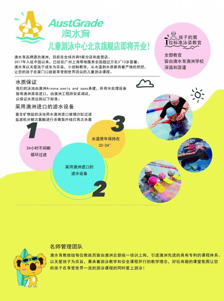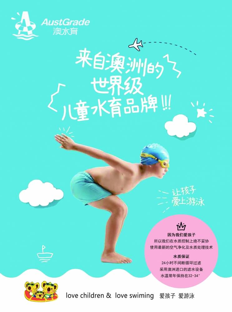 - 因为我们爱孩子,所以我们在水质控制上绝不妥协,使用最新的空气净化及水质处理技术.澳水育早教是澳洲本地品牌,从游泳用水的温度和质量到教授游泳时的安全性和专业性都有严格的把控。 澳水育以关爱孩子成长为宗旨,用最高品质的水质和最专业的安全辅导全程陪护孩子的游泳锻炼和戏水玩耍。把澳水育亲子游泳打造成具有生命力的企业,让孩子健康快乐地在澳水育既锻炼了身体有发展了智力,是每位澳水育精英的决心。 做中国具有“澳水育”品质的游泳企业