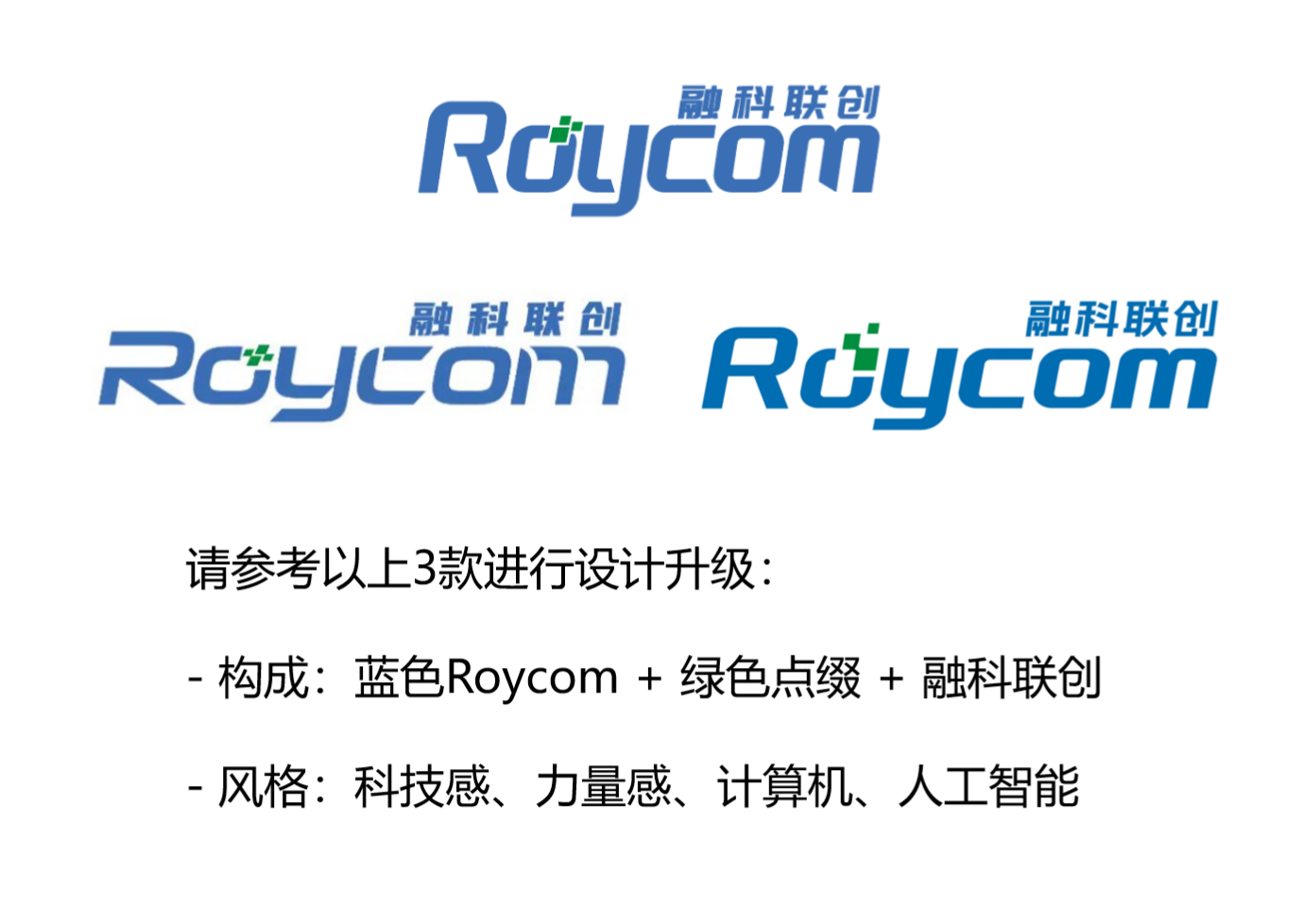 - 设计构成:英文 Roycom 为主 + 中文 融科联创 为辅 + 绿色点缀画龙点睛